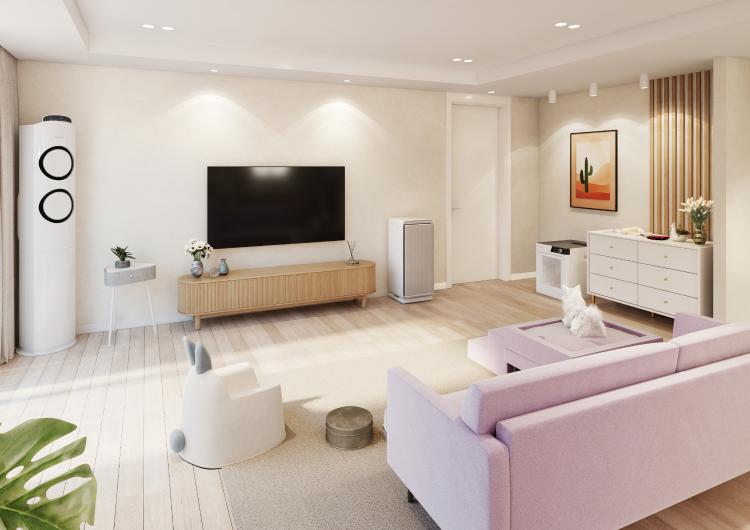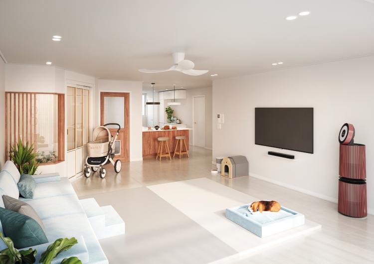 이번엔 짙은 우드가 포인트가 되어주는 신혼집 인테리어 속 펫테리어를 살펴볼까요? 10살이 된 노령견과 함께 생활하는 신혼부부 라이프스타일 공간입니다. 곳곳에 펫테리어를 위해 세심히 신경 쓴 곳들이 보이는데요. 반려견이 주로 생활하는 거실 공간에 반려견 방석을 두어 휴식 공간을 마련해주었네요. 또 눈에 띄는 공기청정기 역시, 반려동물이 주로 생활하는 하단 공간에 집중 청정이 가능한 ‘펫모드’를 장착한 LG 퓨리케어 360° 공기청정기 펫 알파 오브제컬렉션 제품이랍니다.