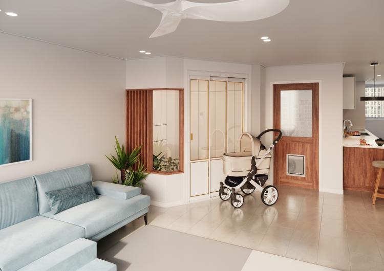 주 생활 공간인 거실에 화장실을 마련하면 냄새도 나고 보기에도 좋지 않죠. 별도 방에 공간을 마련해 두었다고 해도 일일이 문을 열어주기도 힘들 수 있습니다. 그럴 때 반려동물 전용 ‘펫 도어’를 설치해보세요. 사이즈에 맞는 전용 도어라면 안전하고 자유롭게 출입이 가능하답니다. 또, 반려견을 키우는 분들이라면 꼭 추천드리는 중문! 현관문을 열었을 때 갑작스럽게 반려동물이 나가는 사고 예방도 가능하고, 단열과 소음 차단 기능까지 있으니 그야말로 필수템이 아닐 수 없죠.