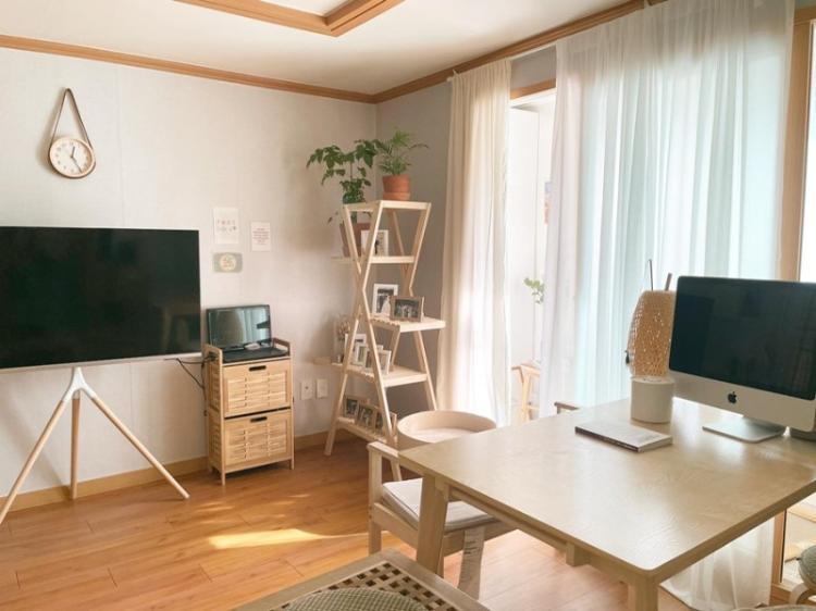 채리 몰딩과 장판이 빈티지한 색감과 한데 어우러지며 우드 가구와 빈티지한 패브릭을 이용하여 집을 꾸몄고 햇빛과 어우러지는 식물로 인해 집안이 한층 아늑하고 따뜻한 분위기로 바뀌었습니다:)