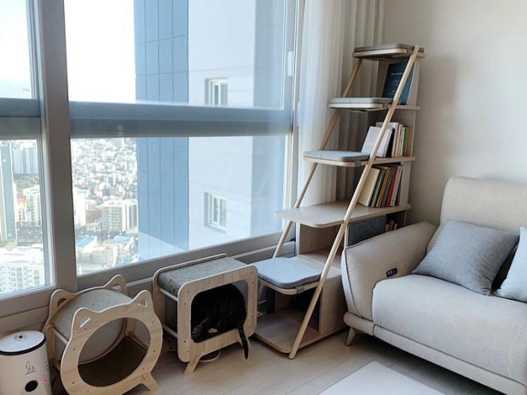 소파도 스크래치가 없는 재질로 선택하고, 거실 곳곳에 스크래쳐를 배치하여 고양이들이 마음껏 놀 수 있도록 집을 꾸미셨습니다.