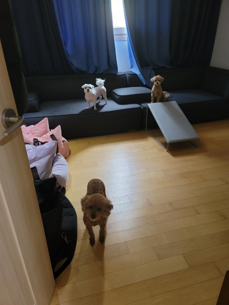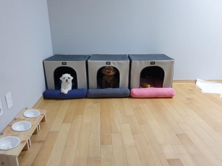 그중 3층이 바로 댕댕이 전용 공간입니다. 3층엔 방이 두 개 있는데요! 한 방은 댕댕이들의 방(각자 독립된 막혀있는 공간)으로 꾸며주었고요. 두 번째 방은 댕댕이들의 놀이방으로 사람과 댕댕이의 공간 분리가 확실하게 되어있어요. 이렇게 같이 살지만 또 각자 공간은 분리하여 공존하는 타운하우스였습니다:)!