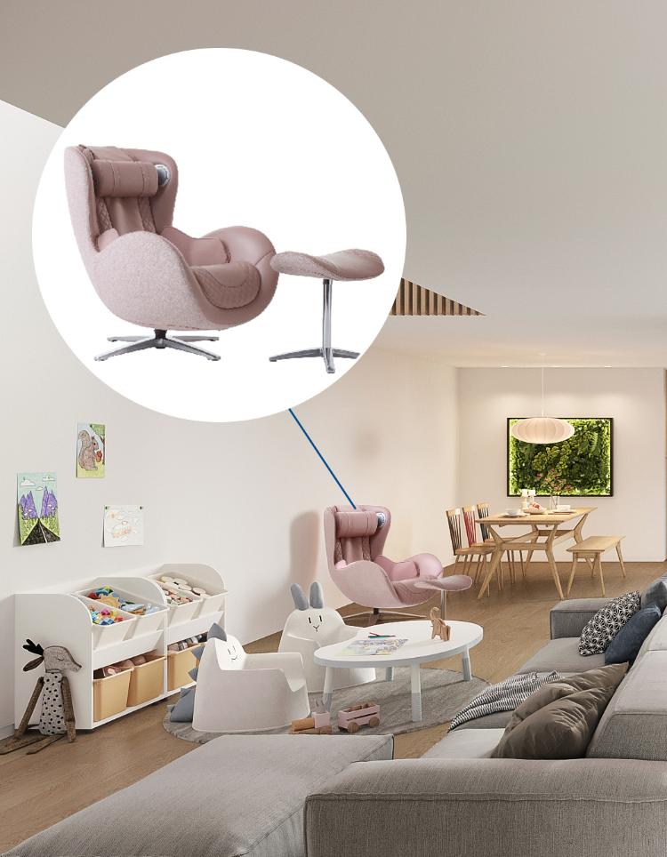 아이에게 시선을 놓치 않으면서 부부에게도 휴식을 줄 수 있는 공간이 필요하죠. 육아에 지친 부부가 아늑한 휴식을 취할 수 있는 안마의자를 다이닝 공간 앞에 배치해 작지만 소소한 힐링 공간을 꾸몄습니다. 기존의 묵직한 안마 의자라면 인테리어를 해칠 수도 있겠지만, 누하스 ‘클래식 타입’ 안마 의자라면 오히려 오브제 가구처럼 인테리어의 포인트가 되어주는 느낌이네요.