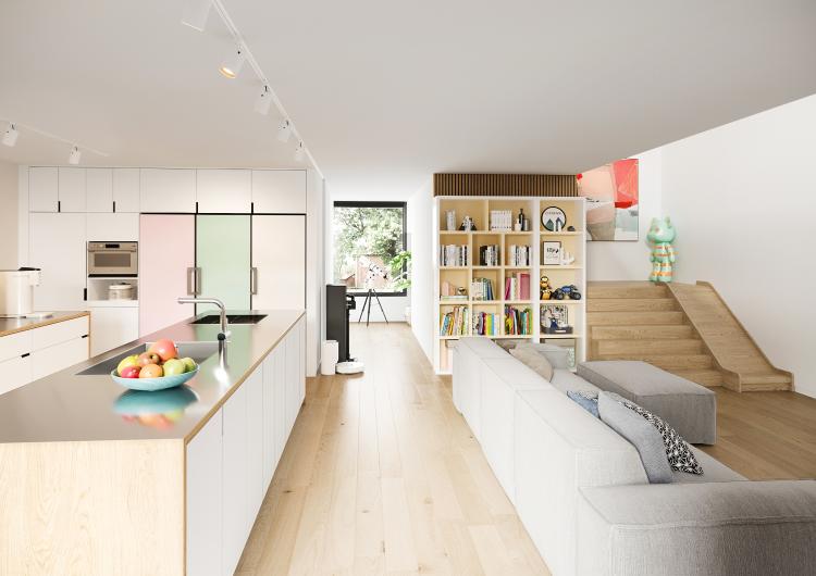 가족들이 함께 생활하는 거실 공간은 마치 놀이터 같은 공간으로 꾸몄습니다. 활동성이 넘치는 아이들을 위한 계단과 미끄럼틀만으로도 그 분위기가 충분히 느껴지죠? 이런 구조는 공간의 확장과 연결은 물론 아이들의 상상력을 키워줄 수 있는 역할을 해준답니다. 거실 계단 옆 동선을 활용하여 큰 책장을 두어 더욱 공간의 분위기를 잘 살렸습니다. 전체적인 인테리어 톤은 밝은 우드의 뉴트럴 톤을 선택해 편안함과 안정감을 더했습니다.