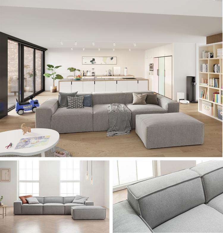 거실에서 소파는 가장 중요한 가구입니다. 특히 아이들과 함께 생활하는 가족일 수록 더욱 섬세하게 고민해서 골라야 하는데요.아이들이 쉽게 오를 수 있고, 딱딱한 골조가 보이지 않도록 마감 처리가 되어 있어야 아이가 다칠 염려가 없습니다. 또, 무언가 흘려도 금방 닦아낼 수 있는 신소재의 패브릭이여야 청소 걱정도 없죠. 이런 점을 고려해 에싸의 바크 소파를 배치해봤는데요, 낮고 넓은 형태의 소파가 공간의 확장성을 더해주네요.