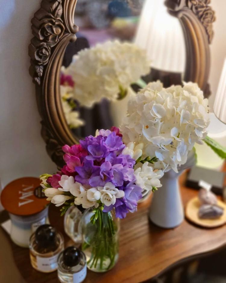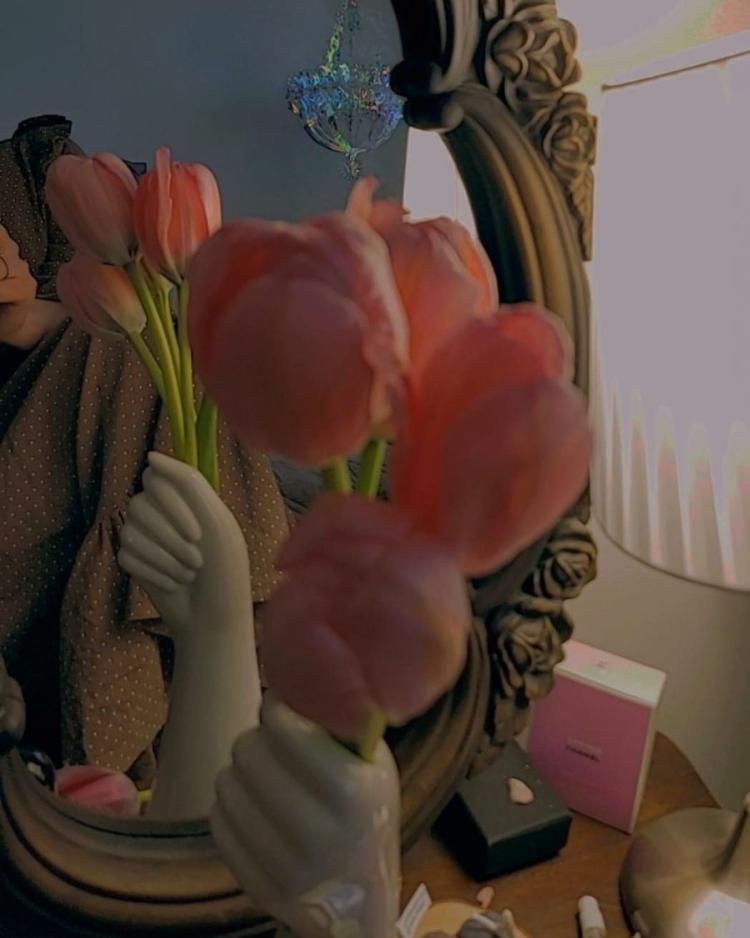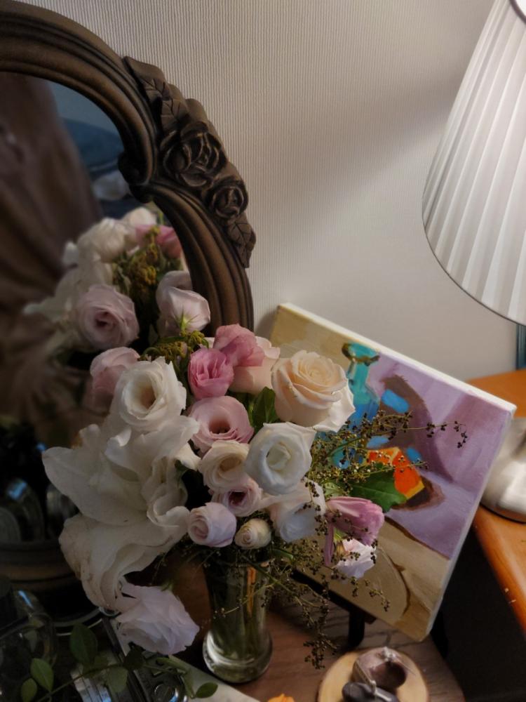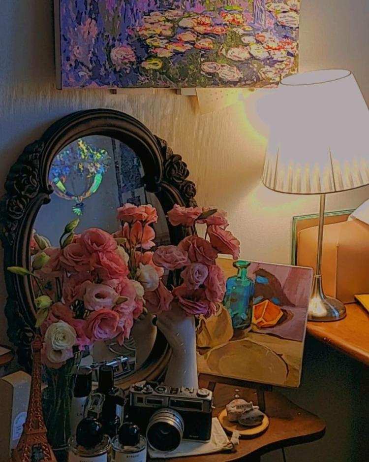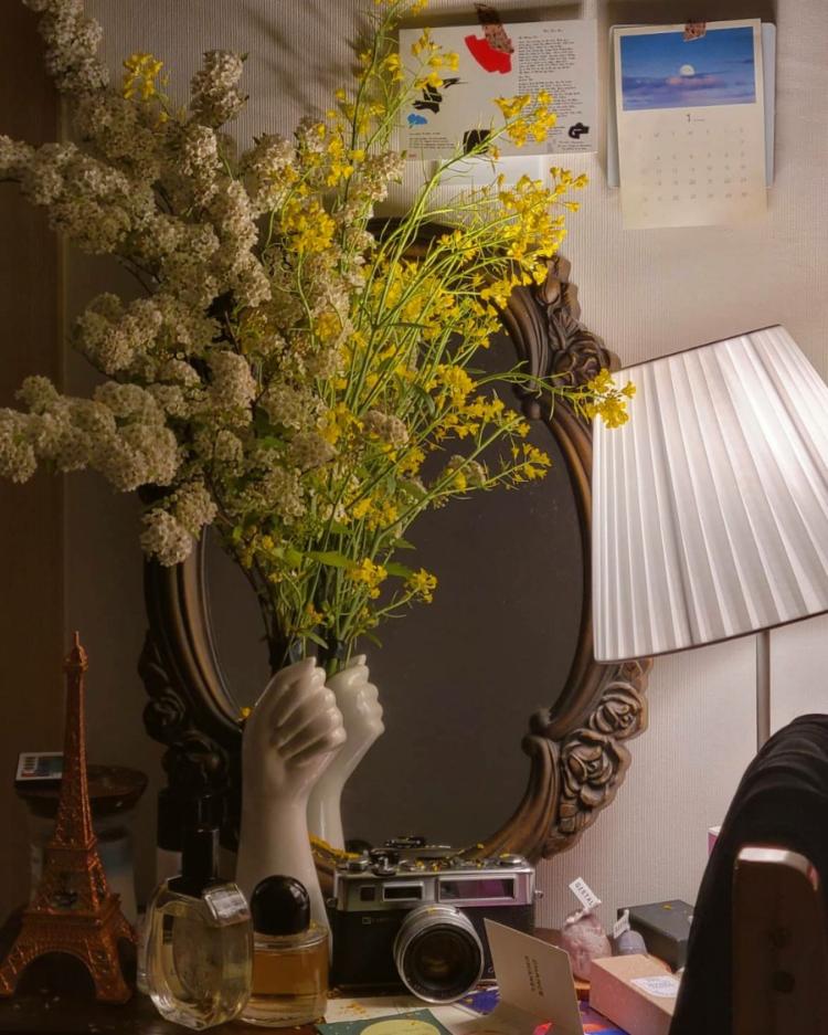 좋아하는 꽃을 계절에 따라 꽂아 놓거나, 직접 그린 그림을 올려두면서 기분에 따라 배치를 이리저리 바꾸는 제 포토 스팟이자 잡다구리 테이블입니다~ 심심할 때 배치를 바꾸고 셀카도 찍어주는데 집에 방문한 친구들의 인증샷 핫플레이스이기도 합니다.꽃을 꽂아 놓을 때 특히 예뻐서 집안의 분위기를 전환해주는 마음에 드는 공간입니다.