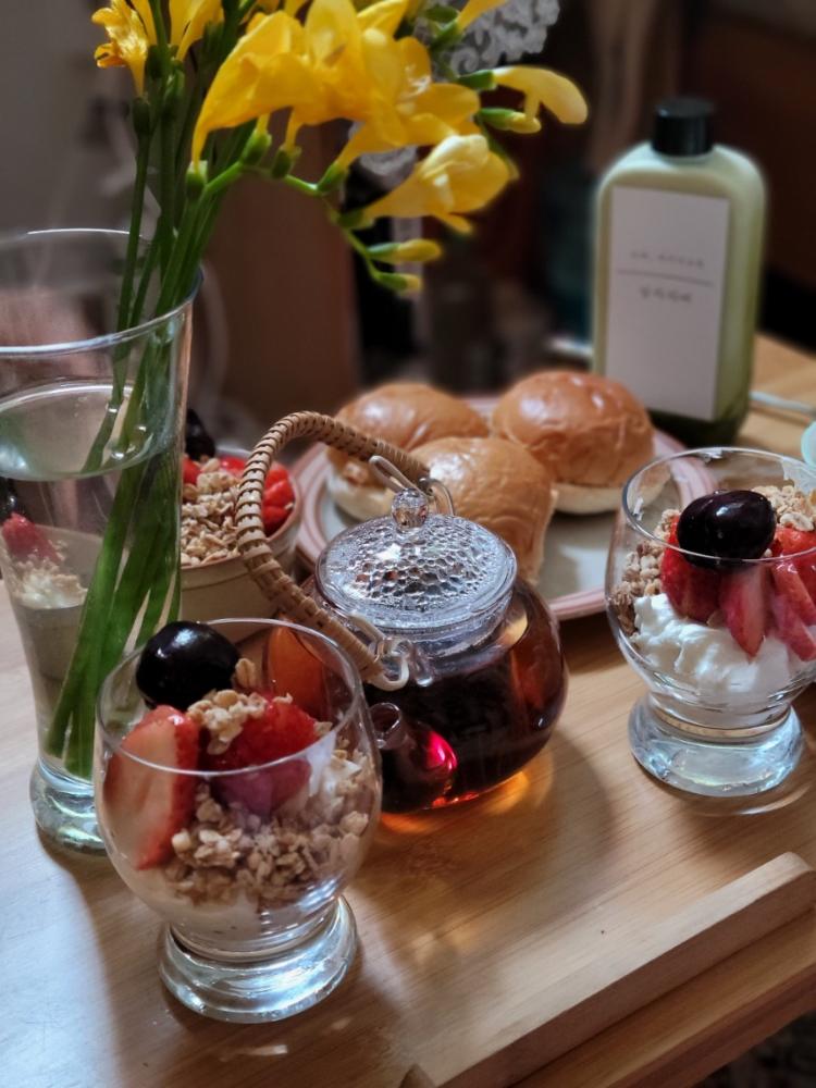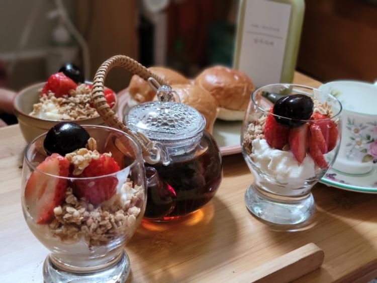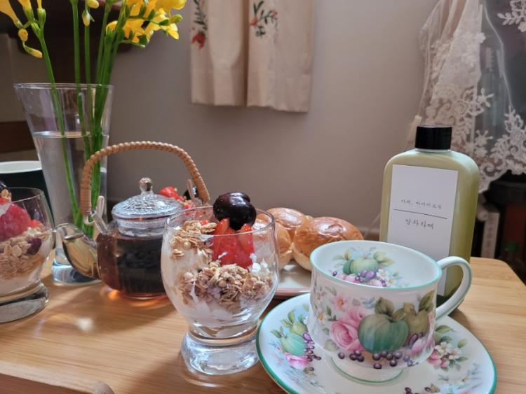 친구들을 불러서 이렇게 예쁘게 한 상 차려 대접하는 걸 좋아합니다. 사실 평소에 혼자 먹을 땐 대충 차려먹기도 하는데, 친구들이 왔다는 핑계로 예쁘게 세팅하고 아껴뒀던 찻잔도 꺼내서 써보는 재미가 있어요. 소꿉놀이 하는 것 처럼 이렇게 노는 것을 좋아했는데 요즘 코로나로 인해 친구들을 집에 못부르게 되어 조금 아쉬워요ㅠㅠ 얼른 다시 모일 수 있는 날이 오길..!