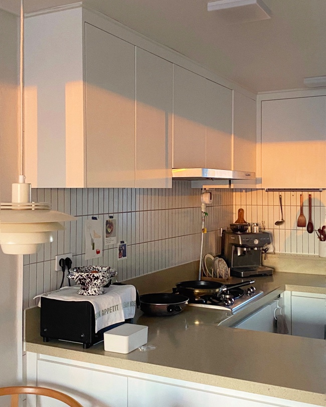 서브웨이 타일로 주방 타일을 덧방하길 정말 잘했다고 생각했던 사진이에요. 곳곳에 있는 빈티지 테이블 웨어들이랑도 잘 어울리고 은은하게 포인트가 되게 귀엽죠?