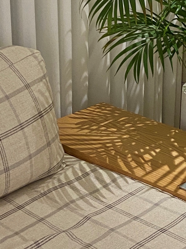 소파는 원래 무지 베이지 컬러의 린넨 패브릭이었는데 소파를 구입했던 비플러스엠에서 커버를 추가 제작했어요. 조금 더 도톰한 린넨의 체크 패턴 패브릭을 구입했는데 패턴이 튀지도 않고 기존 패브릭보다 구김도 적어서 만족도가 엄청 높아요.