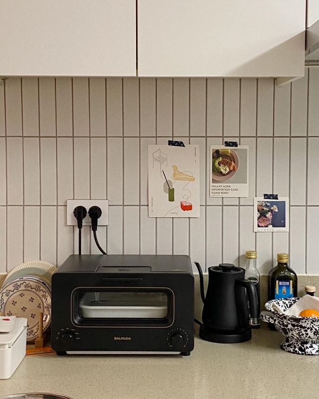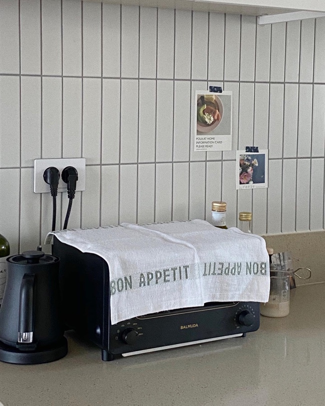 저희집에서 가장 아기자기한 공간이에요. 발뮤다들이 너무 블랙인가 싶어서 빈티지한 느낌의 패브릭을 구입해서 토스터기 위에 올려줬는데 훨씬 밝아보이고 좋더라구요.