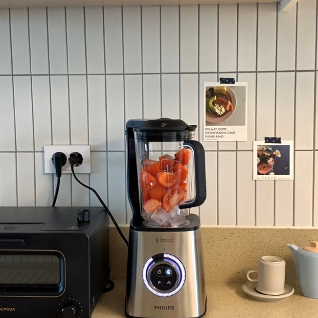구입했던 소소한 것들을 소개하자면, 과일 주스를 만들어 먹고 싶어서 샀던 진공 블렌더에요. 진공 블렌더는 진공 상태에서 갈아주는거라 영양소 파괴가 최소화된다고 하더라구요. 무엇보다 스틸+블랙이라 주방이랑도 잘 어울려서 매우 만족하는 중이랍니다.