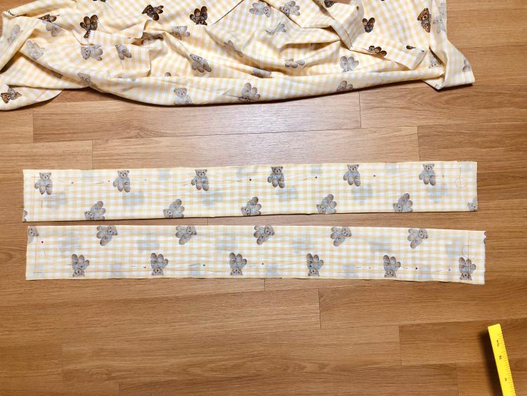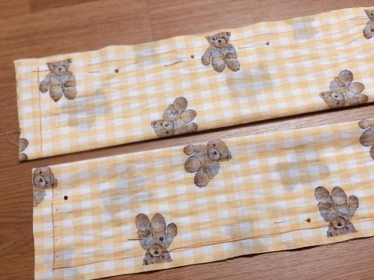 단면으로 작업할 때 보통 시접은 2cm를 내줍니다. 윗면에는 커튼 봉과 연결할 핀을 꽂아야 하기 때문에, 10cm의 시접을 내고, 옆면과 아랫면은 모두 2cm를 주었습니다.