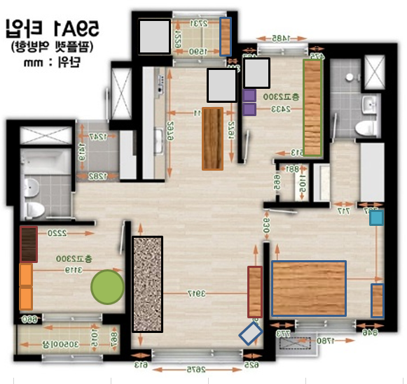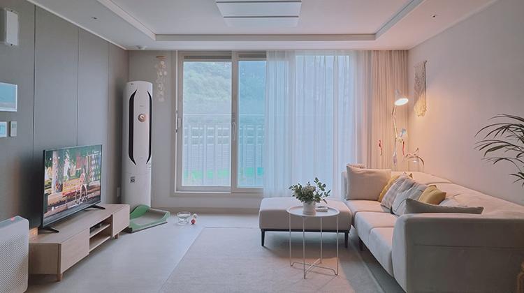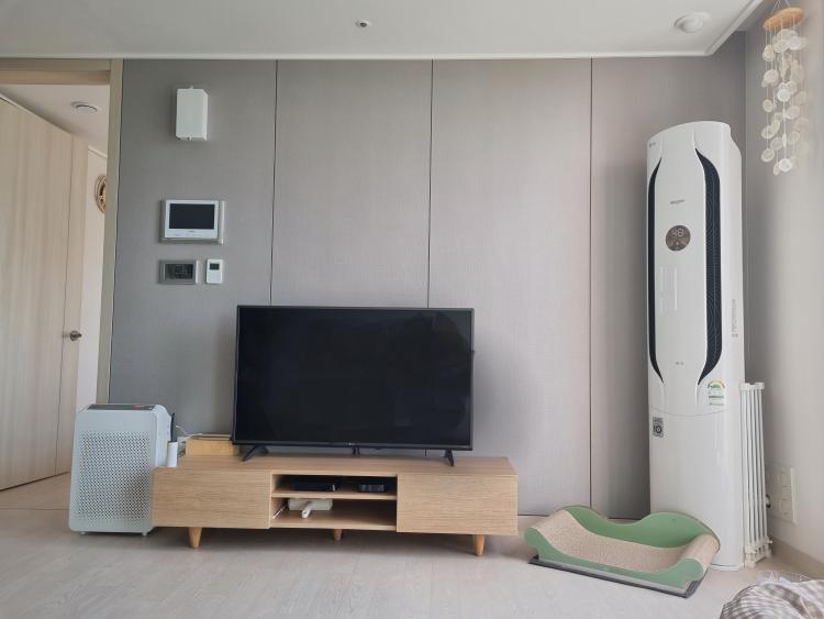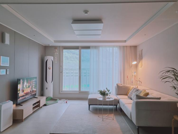 거실은 집의 얼굴인 것 같아요. 판상형 구조여서 복도없이 바로 거실이 보이는 구조라서 처음 마주한 느낌이 포근한 느낌이면 좋겠다 싶었어요.