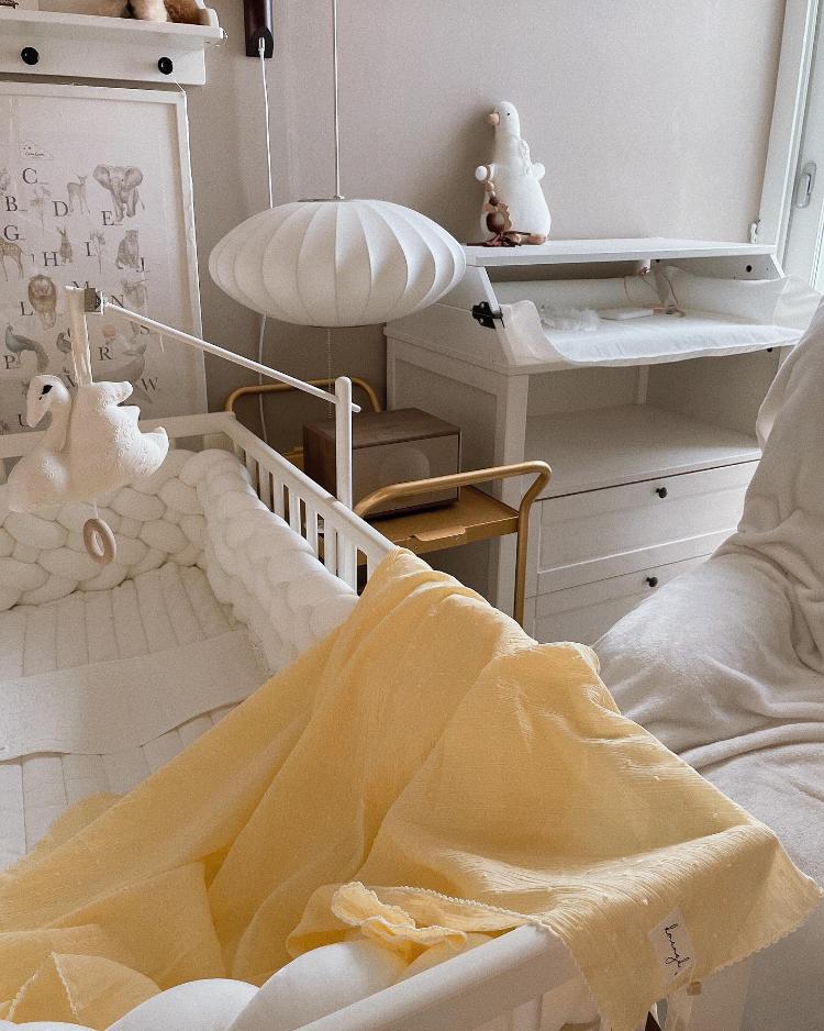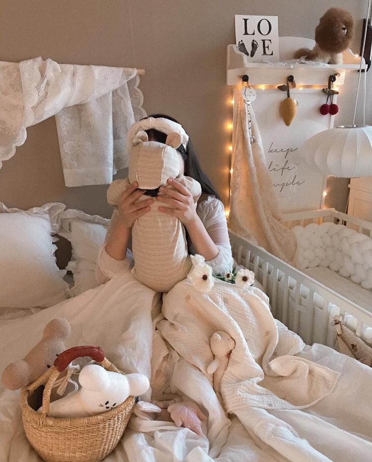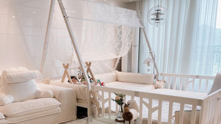 옆엔 아가 침대가 있을 적이에요. 신생아 시절 아가 기념 촬영 해주느라 애착인형도 놓고 침구는 항상 화이트 톤을 유지하고 있어요.