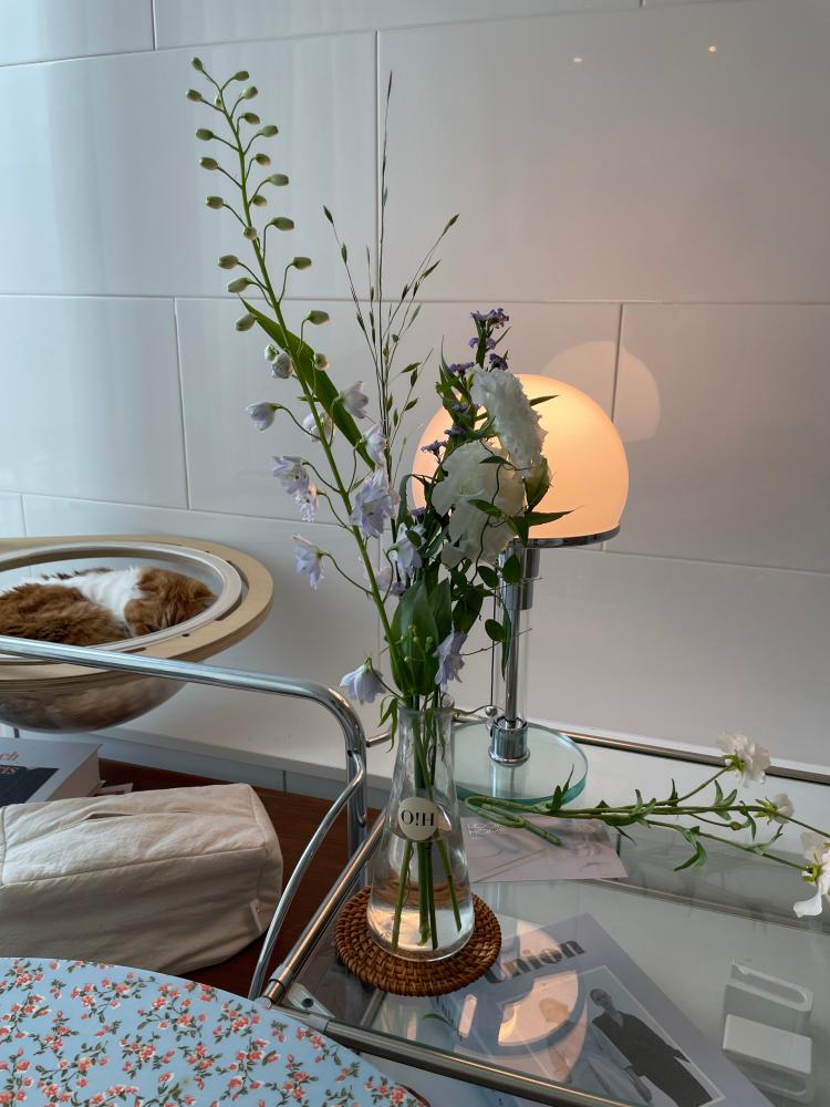 꽃과 조명 모듈가구 그리고 빈티지한 테이블보를 보며 힐링하는 저만의 공간이랍니다.