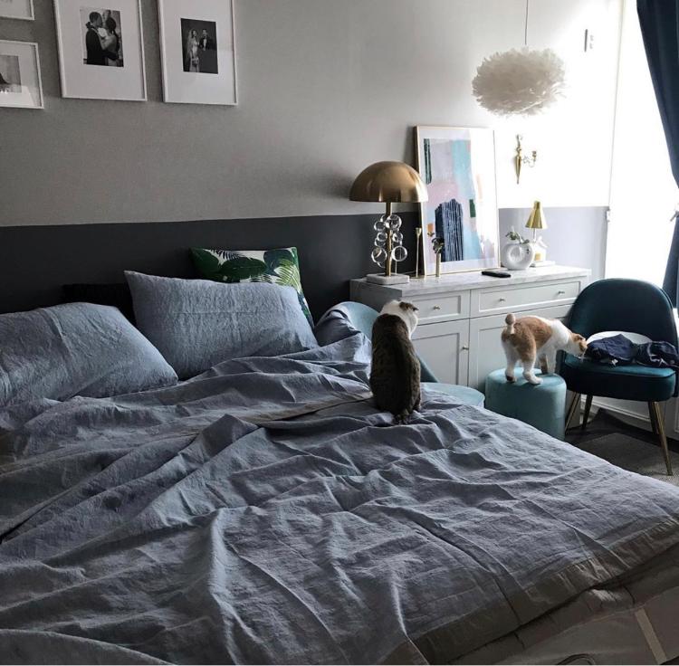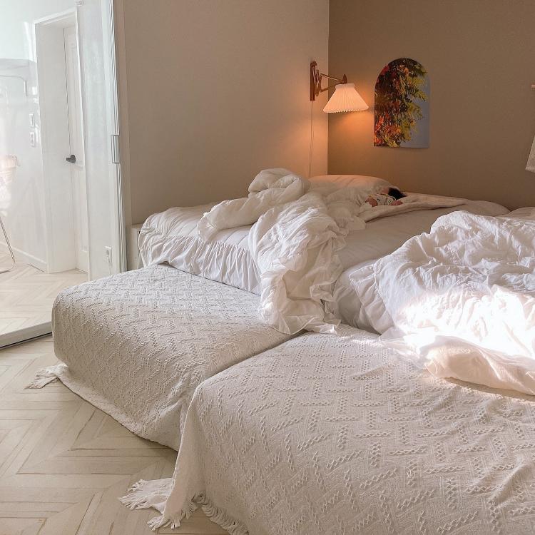 소파 스툴들을 베드벤치처럼 활용했어요. 벽조명과 포스터가 포인트랍니다.