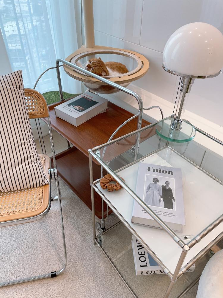 모듈가구와 빈티지 트롤리 그리고 홈카페 테이블이 있는 공간, 주로 야식 먹방 스팟입니다.