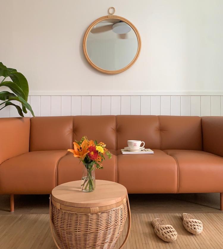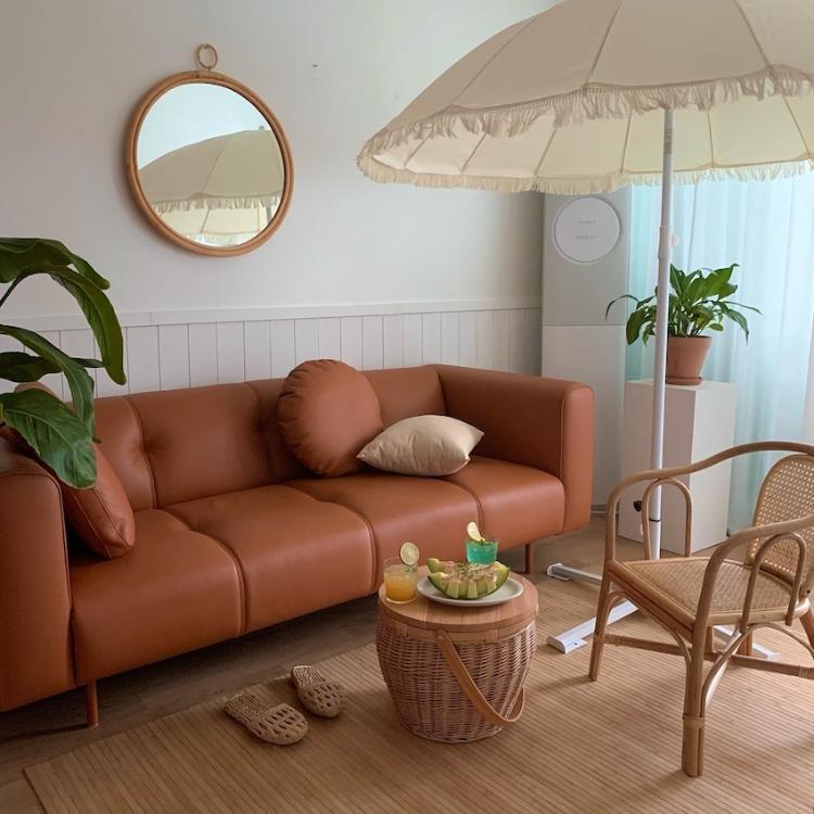 라탄을 이용하여 여름 분위기를 한껏 내주신 오후를 찾아요님의 거실입니다. 밋밋한 거실에 라탄을 이용한 소품들과 큰 파라솔이 매우 인상적인데요. 시원한 에어컨을 틀며 휴향지에 온 느낌과 함께 푹 쉬면 정말 홈캉스가 따로 없을 것 같아요!