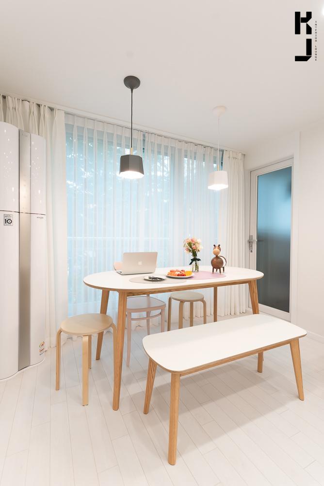 신혼집 인테리어의 거실인데요. 거실을 확장하여 테이블을 놓고 카페처럼 꾸며봤어요. 아래로 떨어지는 흑백이 다른 색의 펜던트 조명이 포인트네요!:)