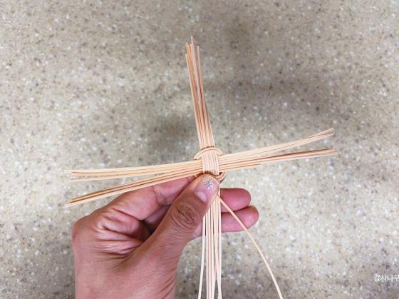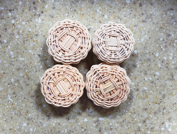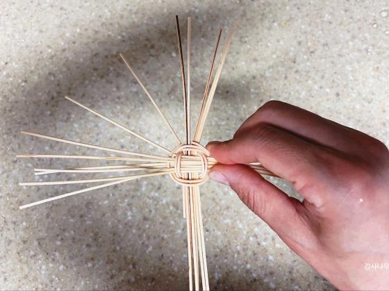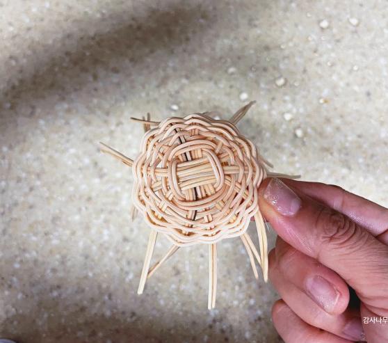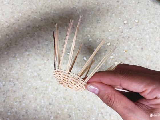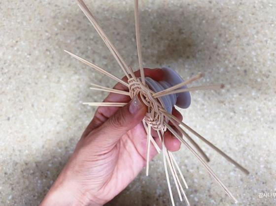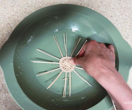 오므리며 엮기 위해 물에 살짝 담가 환심을 부드럽게 만들었습니다.