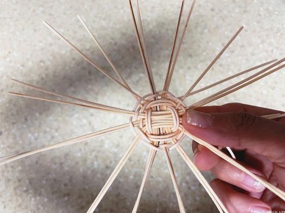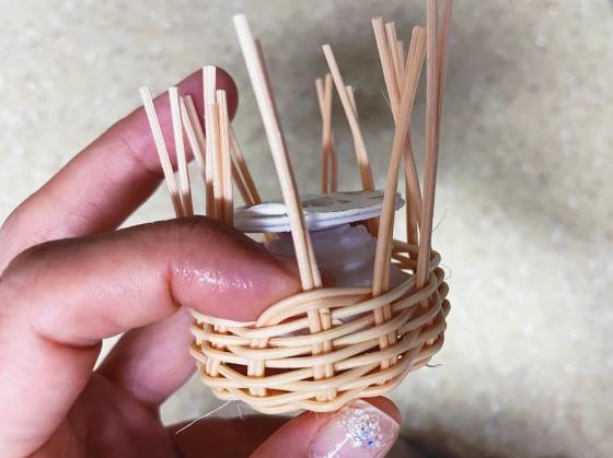 그립톡을 넣고 엮기 시작!! 마무리를 하기 위해 2개의 환심을 빠지지 않을만큼 잘라 다음 환심 뒤로 돌려 넣어요.