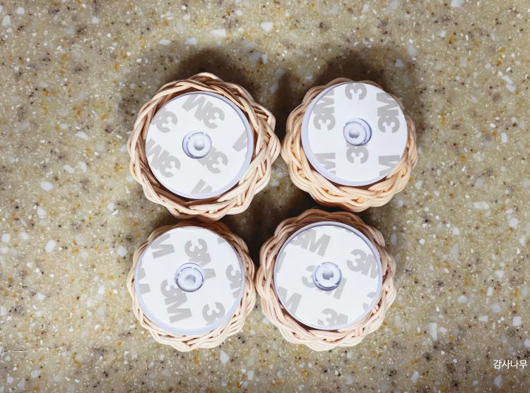 마스크는 어디에 놓으면 가장 좋을까? 고민하다가 현관 신발장 옆에 걸기로 했고요. 이렇게 마스크 걸이를 4개를 붙여 완성했답니다~ 가족 라탄 마스크걸이 완성!! 위에는 아빠, 엄마 아래에는 아들, 딸이 걸도록 했어요.