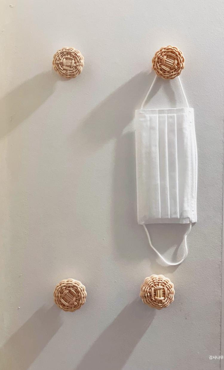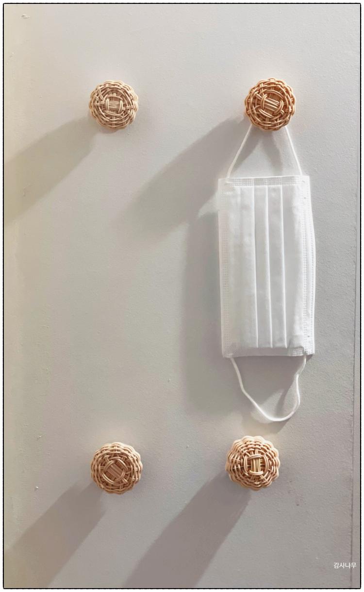 현관 신발장 옆에 붙인 모습! 라탄 마스크걸이를 완성한 후 마스크걸이를 현관 신발장에 붙여 놓으니 가족들도 집에 들어오면서 나가면서 마스크를 편하게 사용할 수 있어서 아주 만족하고 있답니다.
