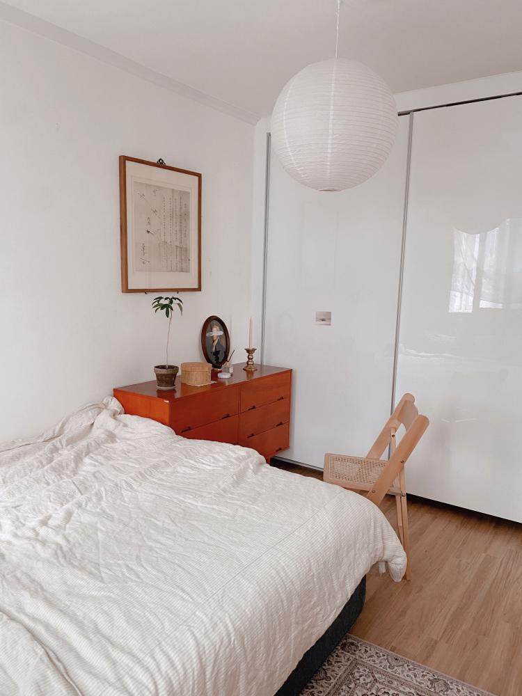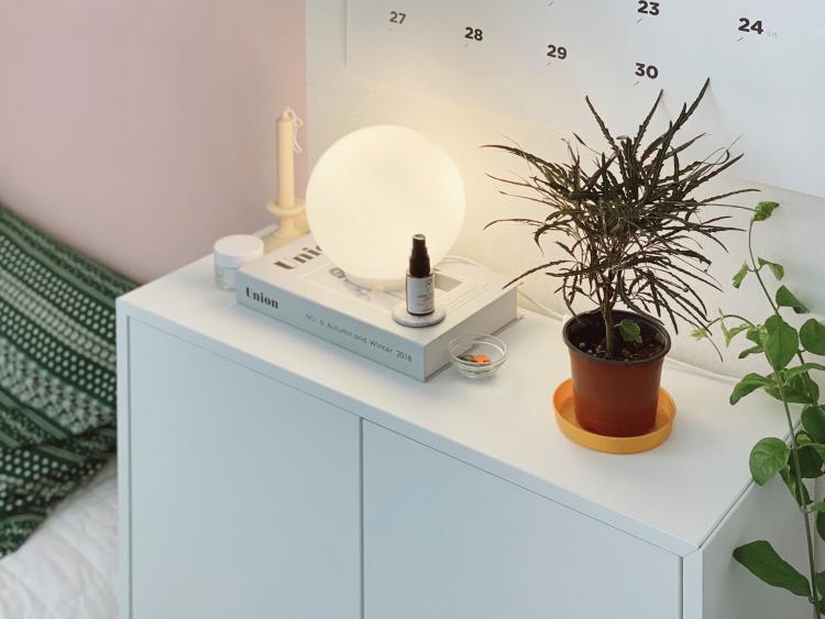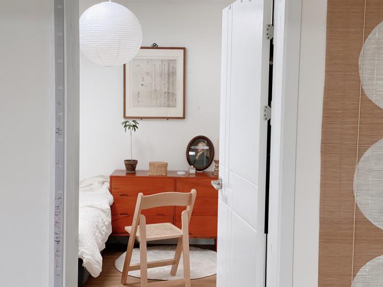 침대를 옮긴 건 공간 활용을 위한 것도 있어요. 지금처럼 붙박이장 옆으로 수납장을 두어 옷을 입는 공간과 잠을 자는 공간 그리고 반대편 테이블을 두어 아이가 잠이 들면 제가 일기를 쓰거나 책을 보는 곳이 생겼어요.