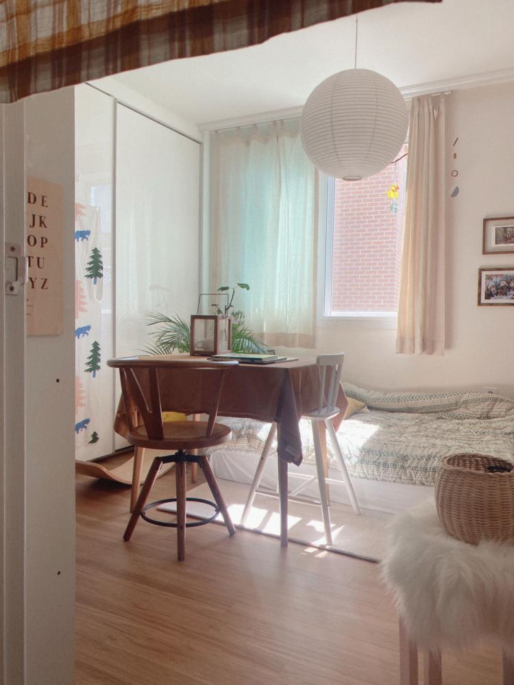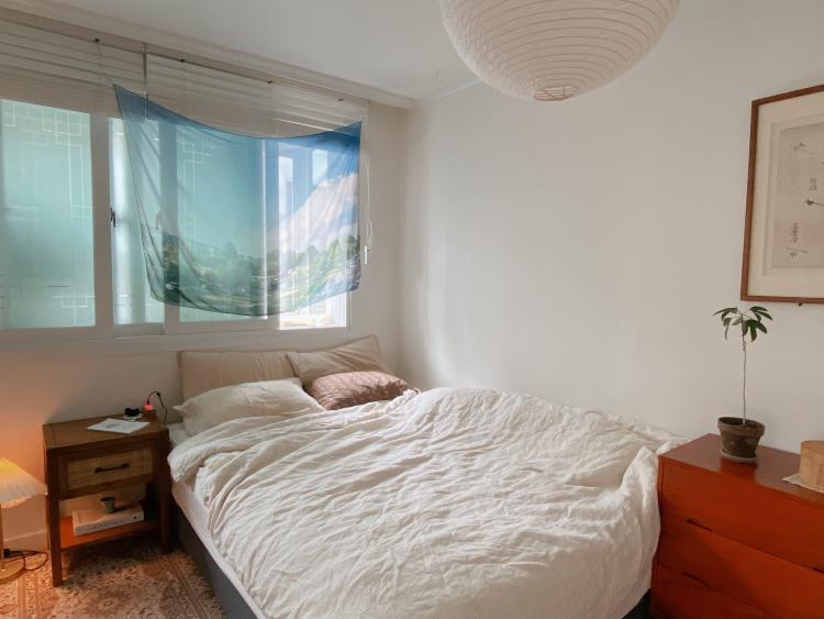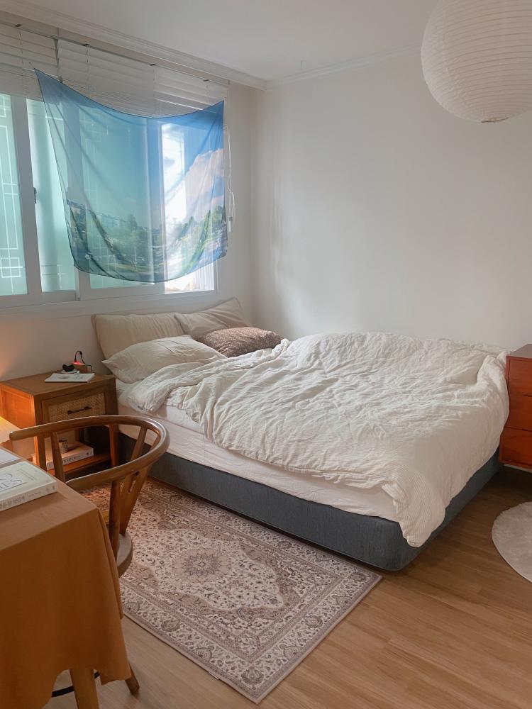 저는 암막 커튼을 선호하지 않아요. 날씨를 그대로 느끼는 걸 좋아해서 사생활 보호로 블라인드를 설치했지만 거의 저렇게 접어둔답니다. 하지만 창문을 열었을 때 옆집의 현관문이 보여서 신경 쓰이긴 해요. 그래서 이번에 쉬폰 포스터를 달았는데 분위기도 살려주고, 매일 맑은 하늘을 볼 수 있게 되었어요.