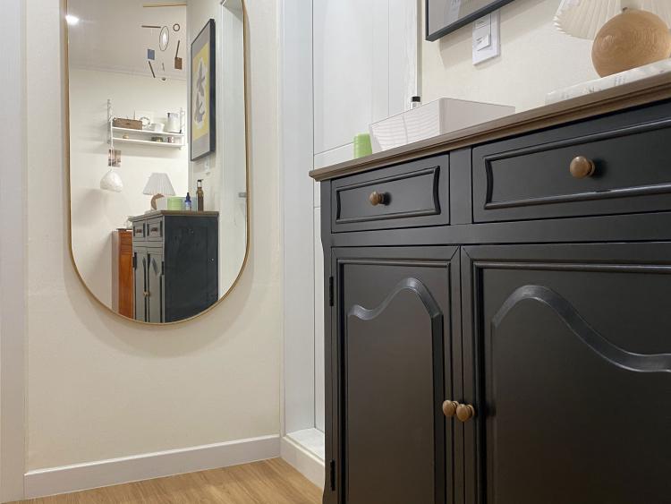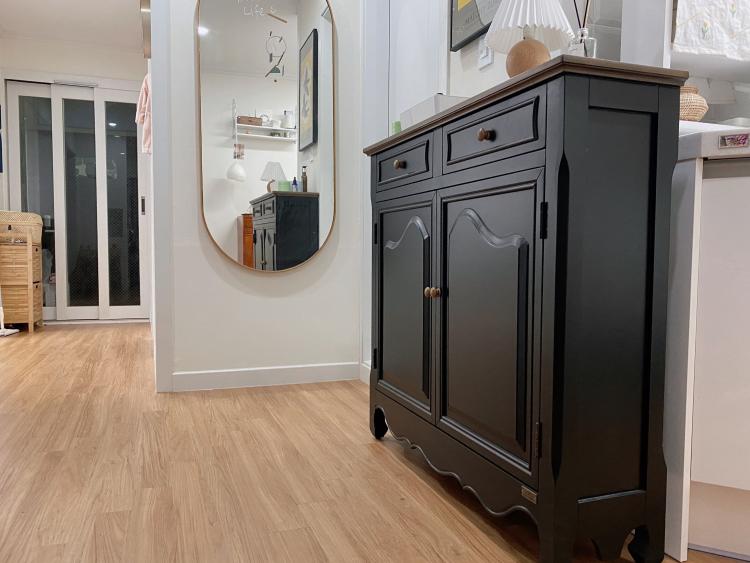거실과 주방을 연결해 주는 작은 복도예요. 이 수납장에는 컵라면, 과자 등 간식거리와 청소 용품들이 보관되어 있어요. 슬림 해서 자리 차지도 많이 하지 않고 이뻐서 활용도가 높아요