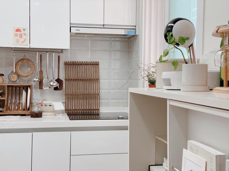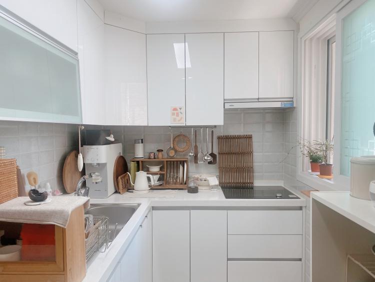 우드 화이트의 결정판인 주방이에요. 얼마 전 들인 우드 디쉬랙으로 완성된 주방의 모습이에요. 요즘은 주방 창문으로도 해가 잘 들어서 화분을 키우고 있어요. 제가 집에 있는 시간이 많아지면서 냉장고 정리와 주방을 더 깔끔하게 유지하려고 애쓰고 있어요. 귀차니즘인 저는 설거지도 몰아서 하는 스타일인데 요즘은 그때그때 정리하는 것을 목표로 하고 있어요. 그래서인지 주방이 깔끔해야 하루가 마무리된 기분이에요