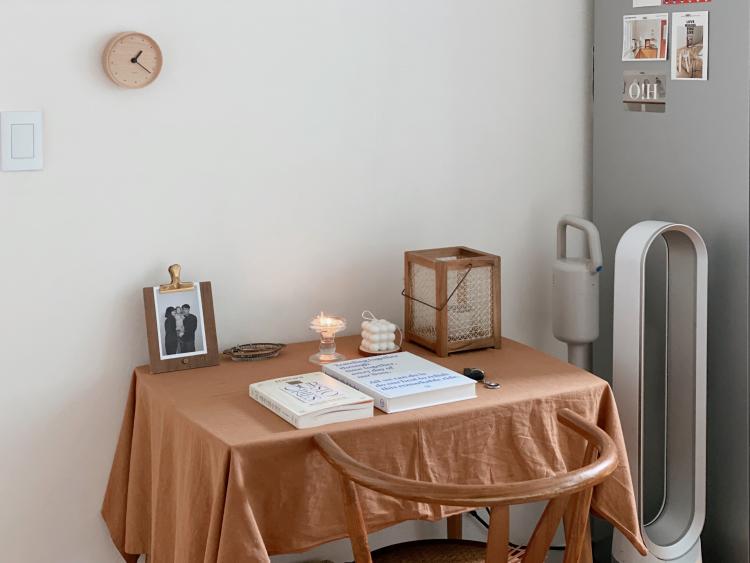 테이블 옆에는 스타일러와 선풍기, 청소기 등 가전제품을 보관하고 있어요. 저희 집 스타일러는 거의 공기 청정용으로 사용하고 있어요.^^