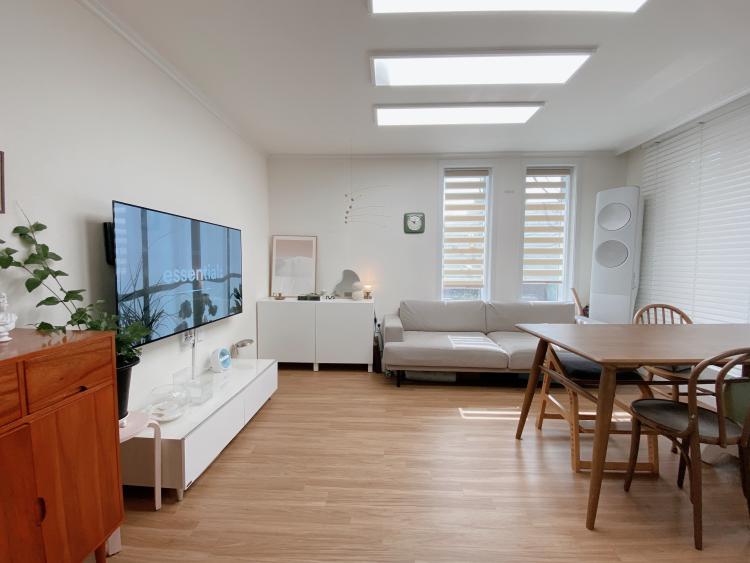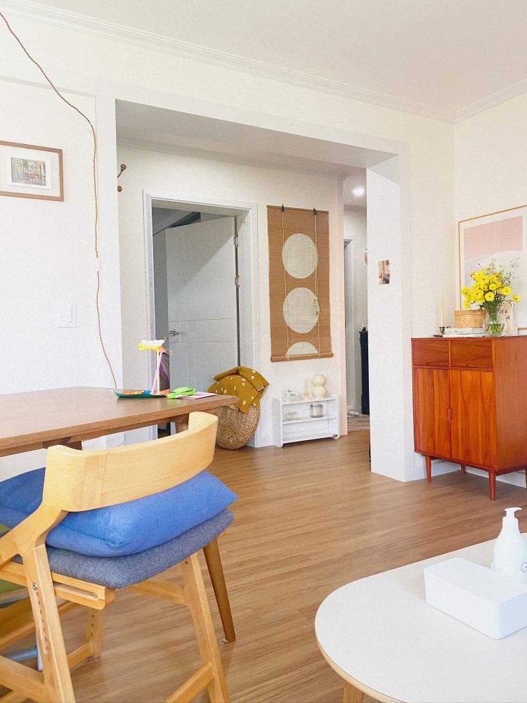 거실의 전체 모습이에요. 거실은 온 가족이 함께 생활하는 공간이기 때문에 최대한 아무것도 안 두고 싶었어요. 큰 가구들이 많아서 자잘한 것들이 있으면 어수선해 보이더라고요. 그래서 하얀색 수납은 아이 물건을 정리하고, 우드 가구는 온 가족을 위한 비상약, 공구들이 있어요. 또 테이블 뒤쪽에 책장을 옮겨 공부도 만들기도 식사도 이곳에서 해결해요.