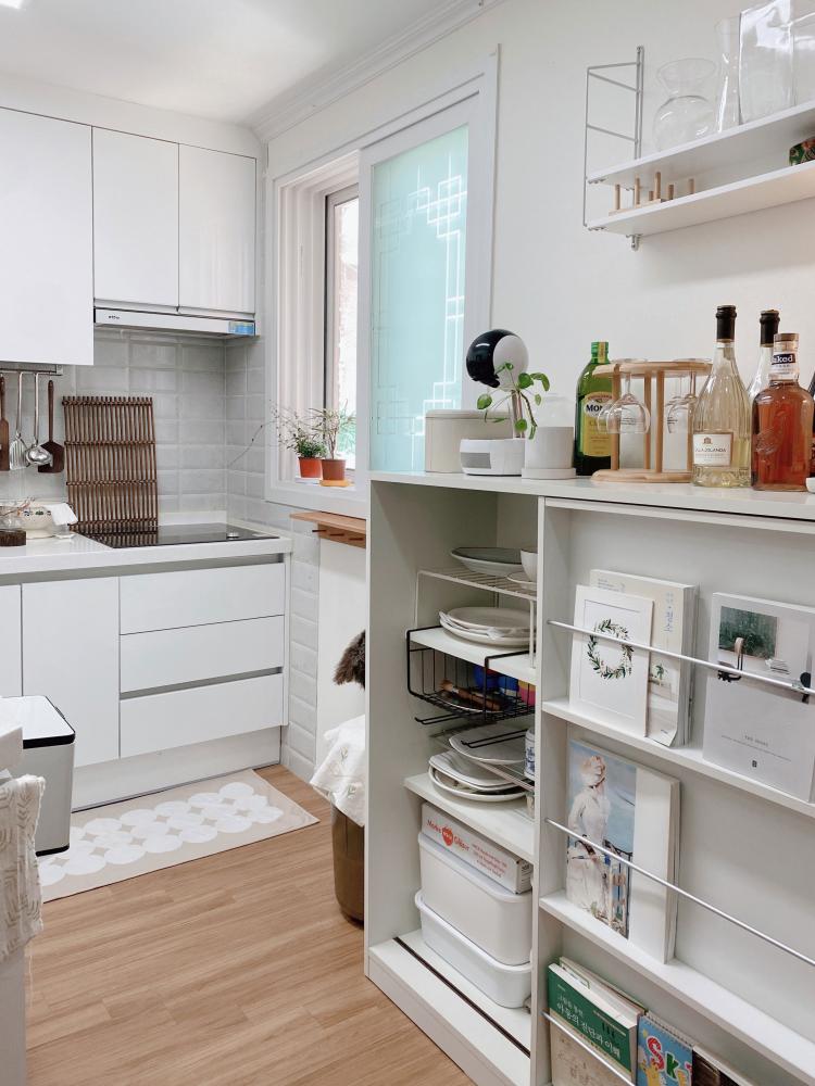 처음 집들이 땐 거실에 있던 아이 책장이에요. 큰 책장을 추가로 들이면서 더 이상 책을 보관할 필요가 없어져서 비울까 하다가 주방으로 옮겨 그릇장으로 사용하고 있어요. 아무래도 주방이 작다 보니 수납공간이 많이 필요해서 그릇들과 와인 등 주방에 필요한 다른 것들을 보관하고 있어요.