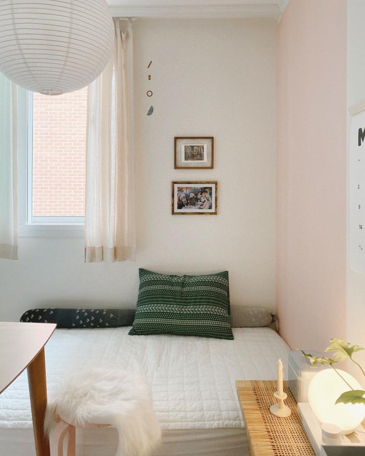 침대 프레임이 없기 때문에 페인팅으로 공간을 분리해 주고 책장이 오래 있어서 더러워진 벽을 깨끗하게 해주기 위해서도 결정했죠. 아이가 너무 좋아해 줘서 기분이 좋아요.