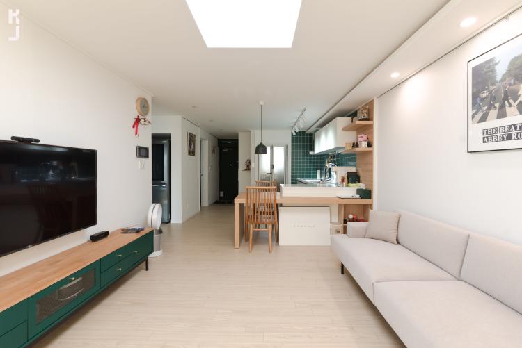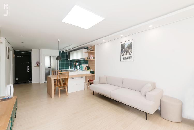 간접등박스는 거실에서부터 부엌까지 쭉쭉 뻗어있는 형태에용. 좀 더 넓어보이고, 시원시원해 보이는 간접등 디자인이죠 :D 따뜻한 컬러감의 쇼파도 너무 이쁘네용! 클라이언트님께서 직접 구매하신 거실장도 부엌 컨셉과 너무 잘 어울려요. 그린과 오크와의 조합! 너무 이쁘잖아..!