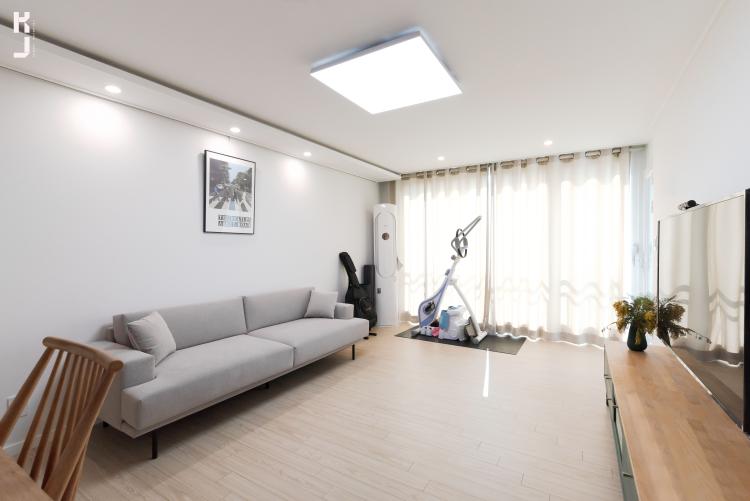 밝은 오크톤의 강마루와 따뜻한 컬러감의 화이트톤으로 화사하게 기본 베이스 톤을 잡았습니다. 요즘은 기본 바탕을 군더더기 없이 깔끔하게 표현하고, 소품이나 가구로 포인트를 주는게 답이죠!!