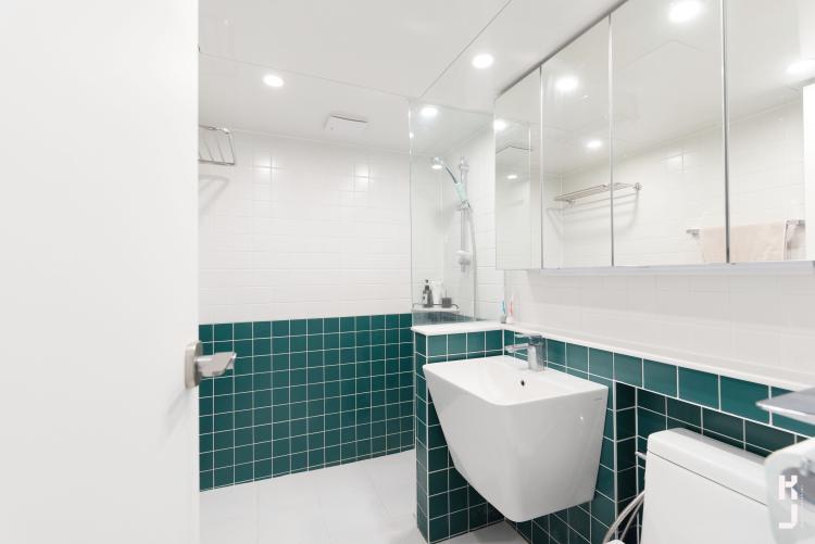 샤워 파티션 하부에 조적 젠다이를 시공하고, 상부는 유리를. 그린 모자이크타일과 넘나 잘 어울리는 파티션 디자인! 사각 세면대와 양변기까지 참 트렌디하다 그죠~?ㅎㅎ