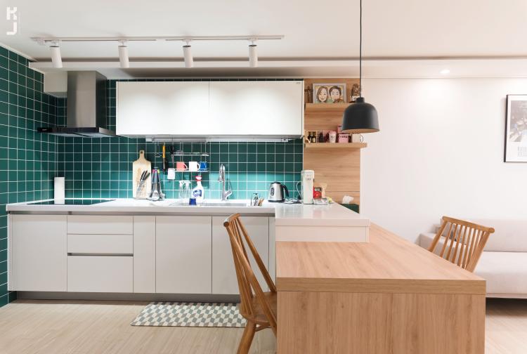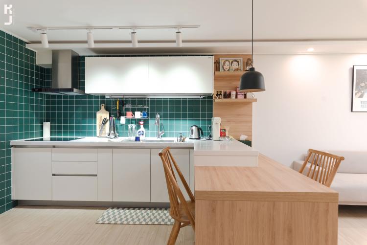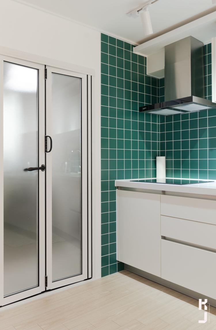 깔끔하게 화이트톤 주방시공. 포인트는 타일에 주었죠! 바로 그린! 싱그럽고 화사합니다 ㅎㅎ 그린컬러의 모자이크타일에 화이트 줄눈을 시공하니 선명하게 드러나는 그린 타일 조각들♡