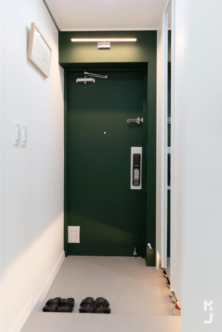 그린 현관문으로 그리너리 인테리어를 마무리! 현관은 연그레이 타일로 시공해서 그린 컬러의 현관문에 좀 더 집중할 수 있게 ㅎㅎ
