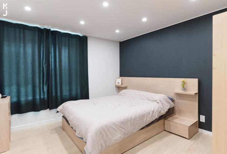 안방 침대 헤드쪽 벽에도 진그린 컬러의 벽지를 시공했어요. 오크톤의 마루와 오크 침대프레임 그리고 오트밀 계열의 침구까지.. 완벽해! 그리고 그린 커텐으로 깔맞춤 ㅎㅎ