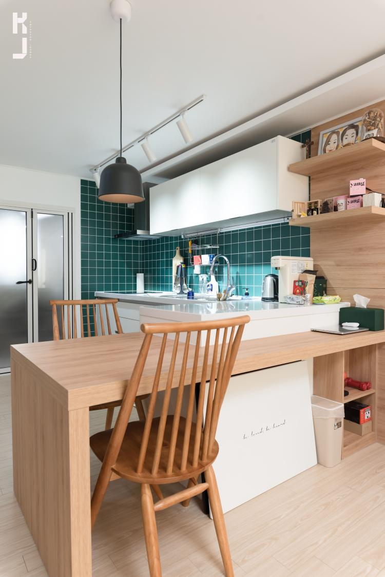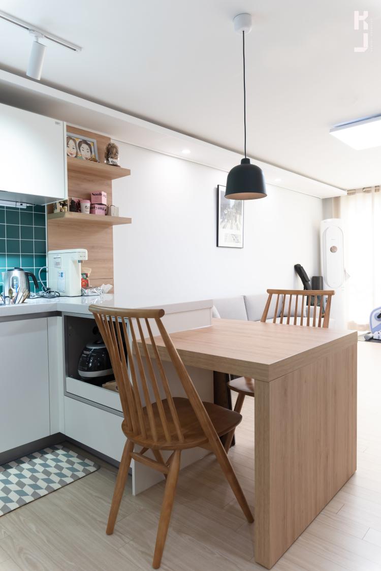 일자주방은 수납도 디자인도 아쉬워요. 'ㄱ'자로 시공하고, 오크톤의 식탁을 함께 시공했어요. 나란히 앉아서 식사하면 꿀맛이겠는데요 ^,^ 아일랜드 벽면쪽은 오크식탁과 같은 재질의 벽체판넬로 시공했어요! 선반으로 아이템들 올려주니 인테리어 효과 +100.