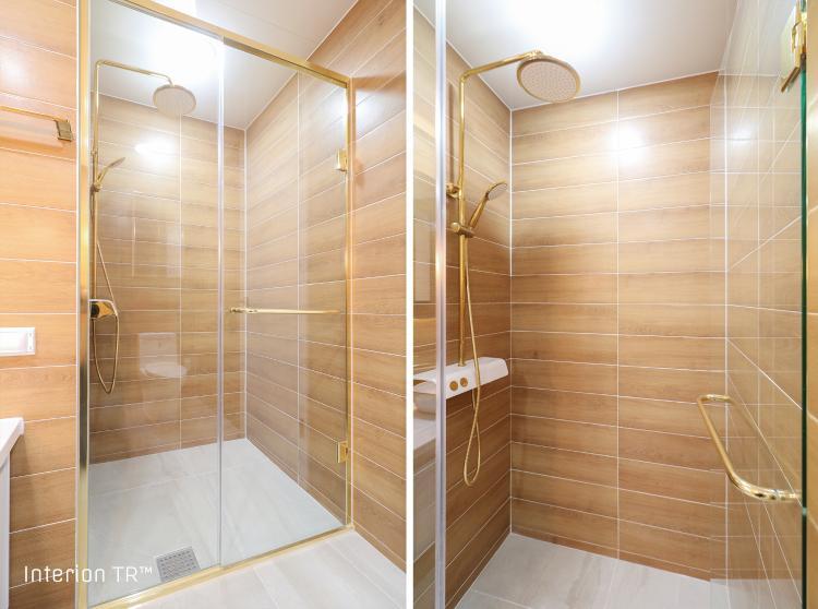 공용욕실의 모습입니다. 앞에 느낌과는 다르게 벽면에 우드 느낌의 타일을 적용해 내추럴한 분위기를 연출했네요. 골드 포인트로 고급스러움 또한 더해주었습니다. 한 집이여도 멋스럽게 두 공간을 인테리어 한 샤맘맘님의 공간이었습니다:)!