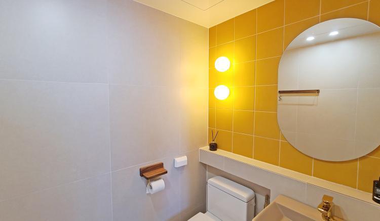 안방화장실은 600각 타일로 시공하셨는데요. 앞선 우드 인테리어와는 달리 과감한 노란색 타일을 이용하여 화장실을 꾸며주셨습니다. 좁은 공간이지만 밝은 노란색을 사용하니 더 밝고 넓어보이는 효과도 있네요:)