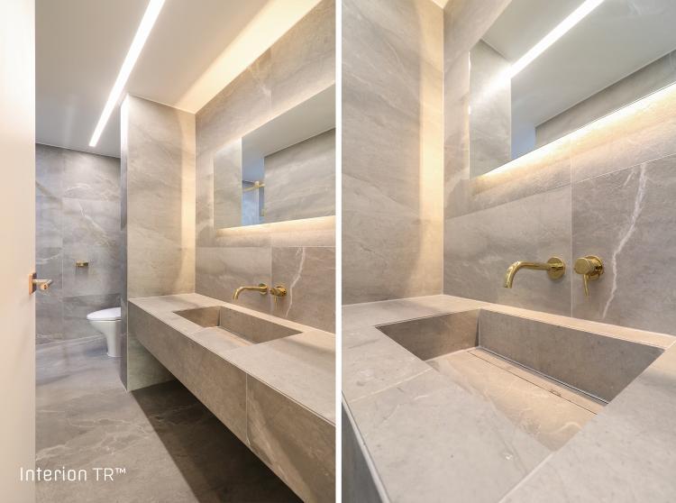 포세린 타일로 시크하면서 고급스러운 느낌이 가득인 욕실인테리어입니다. 세면대 또한 포세린 타일로 제작했는데 매립 수전을 적용하여 전체적인 완성도를 높였답니다.욕조부분도 타일로 제작하였는데 세면대가 있는 공간과 분리되도록 가벽을 설치해주었습니다
