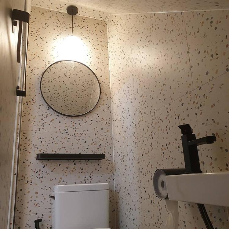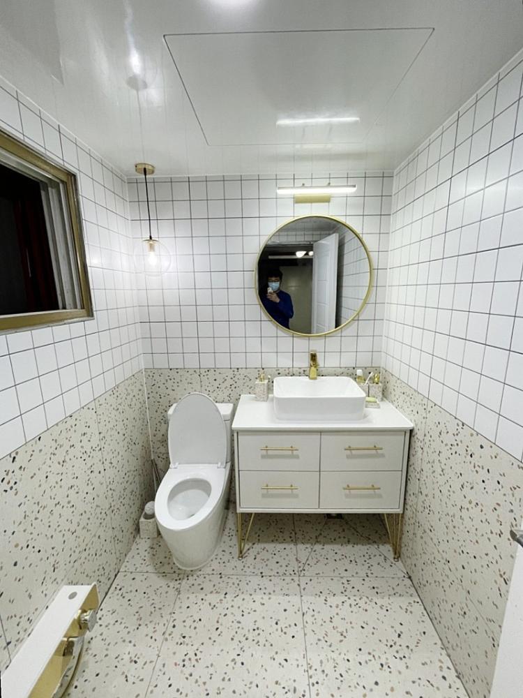 홍콩의 뉴트로한 감성을 좋아하시는 스더언니님의 화장실입니다. 화장실 두 곳 다 직접 디자인하고 인테리어를 하셨는데요. 가장 넓은 메인 욕실은 테라조의 타일로 시공하셨고 상부에 수건장을 과감히 없애고 시야를 확보하셨습니다. 골드 포인트가 돋보이는 공간이네요.