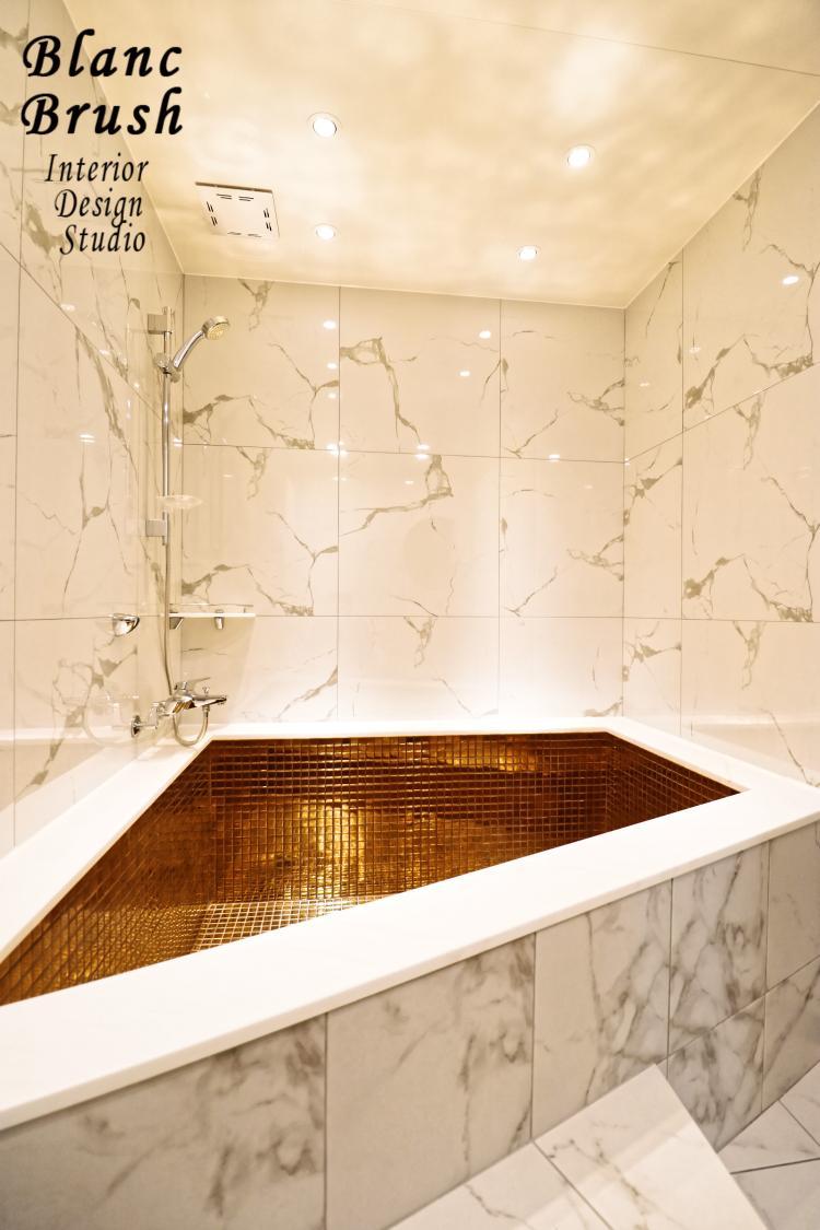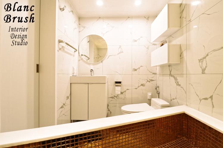 마치 호텔 욕실을 옮겨놓은 듯하네요! 블랑브러쉬 인테리어의 욕실입니다. 욕조부분은 골드타일을 활용하여 다른 배색을 주었고, 나머지곳을 전부 대리석을 사용하여 멋스러움을 뽐내시네요.