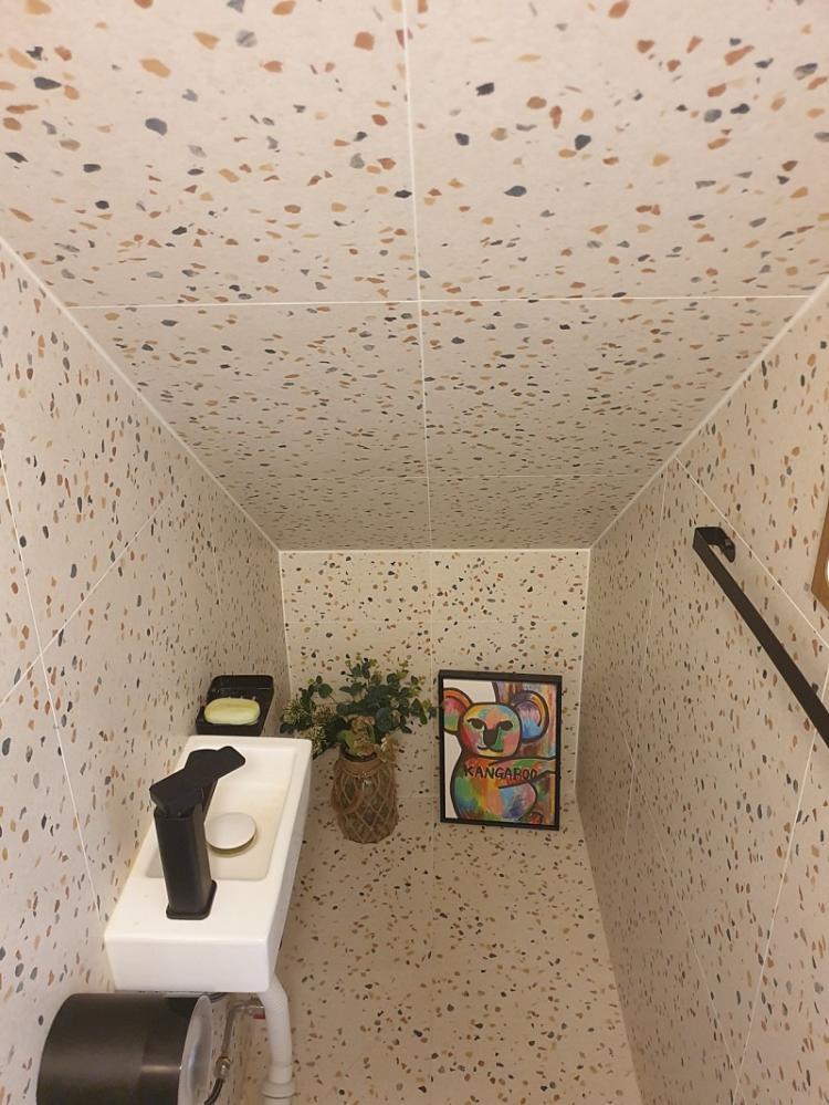 계단 밑 작은 화장실입니다.손님용 화장실이 될 거라 미니멀 하게 꾸미셨습니다. 그림 감상을 위해 가장 좋아하는 작가님의 그림도 걸어주셨어요. 레트로 느낌을 위하여 따뜻한 전구와 테라조 타일을 이용하셨고 밑층과는 다르게 블랙으로 포인트를 주셨습니다:)