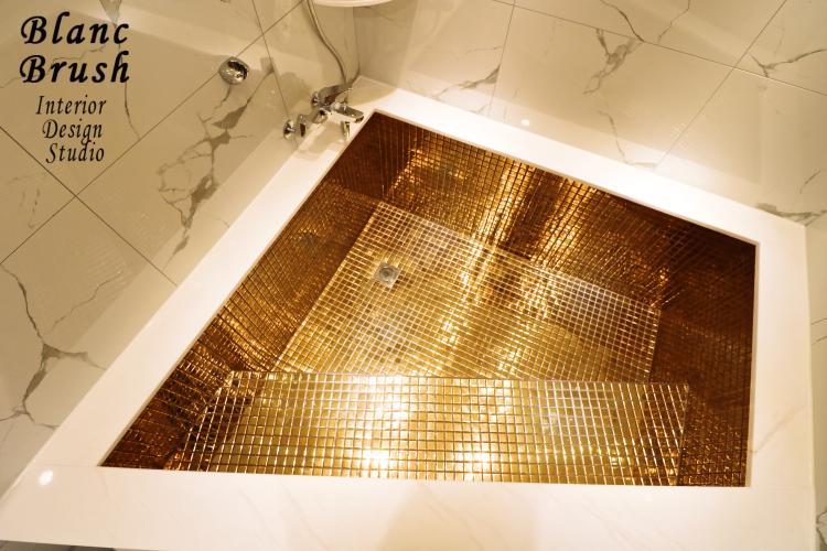 앞쪽 상단엔 대리석과 같은 화이트로 색을 맞춰 인테리어 하셨네요. 욕조는 공간을 최대한 활용하여 비대칭으로 맞추셨는데요! 앞에 앉는 공간을 따로 마련하여 정말 색다른 느낌의 욕실이 탄생한 것 같습니다:)대리석과 황금빛 타일의 조화가 정말 고급스럽지 않나요?
