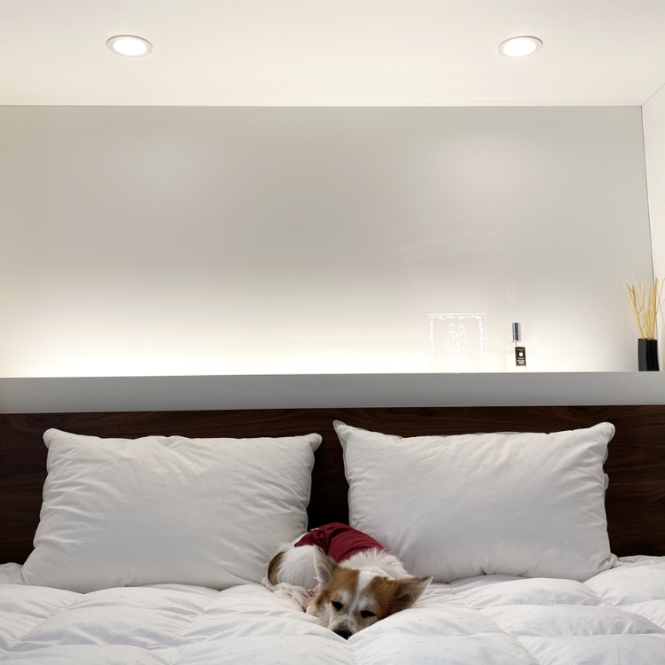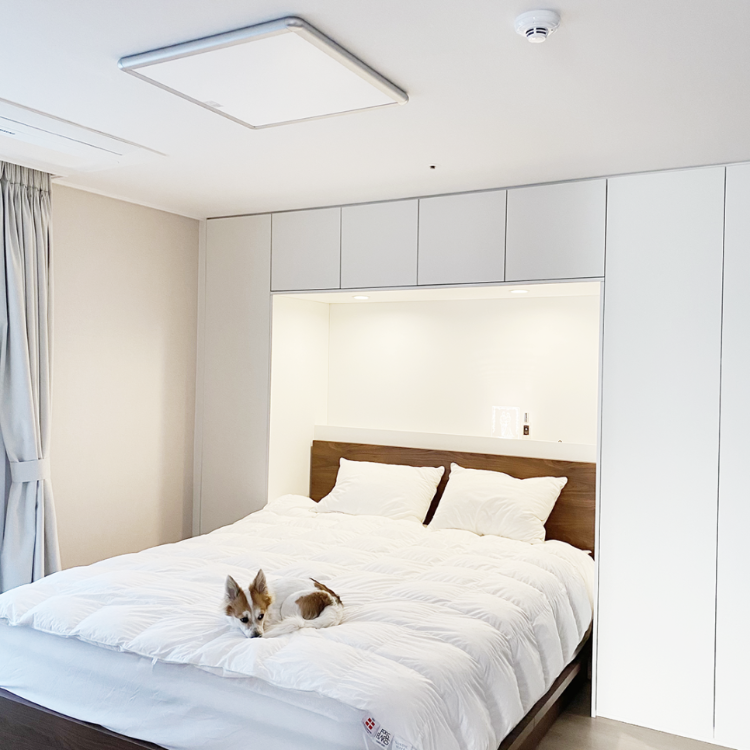 침구류를 보관하기 위해 이렇게 침대장을 시공했는데 정말 아늑한 느낌이에요. 침대장에도 간접등을 위 아래로 설치해서 은은하면서도 따뜻한 분위기를 낼 수 있어요 😊