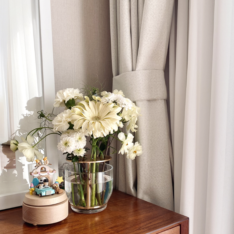 침대에서 마주 보이는 장식장 위에도 화병을 놔두어 화사한 분위기를 유지하고 있어요